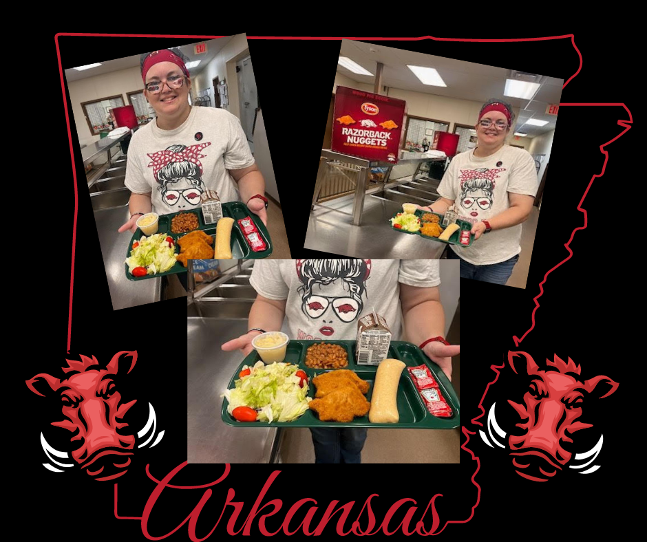 It's RAZORBACK DAY in the Cafeteria. Check out our Child Nutrition Director, Tiffaney Jackson, with our awesome Tyson Razorback Nuggets and the rest of our delicious Friday lunch!